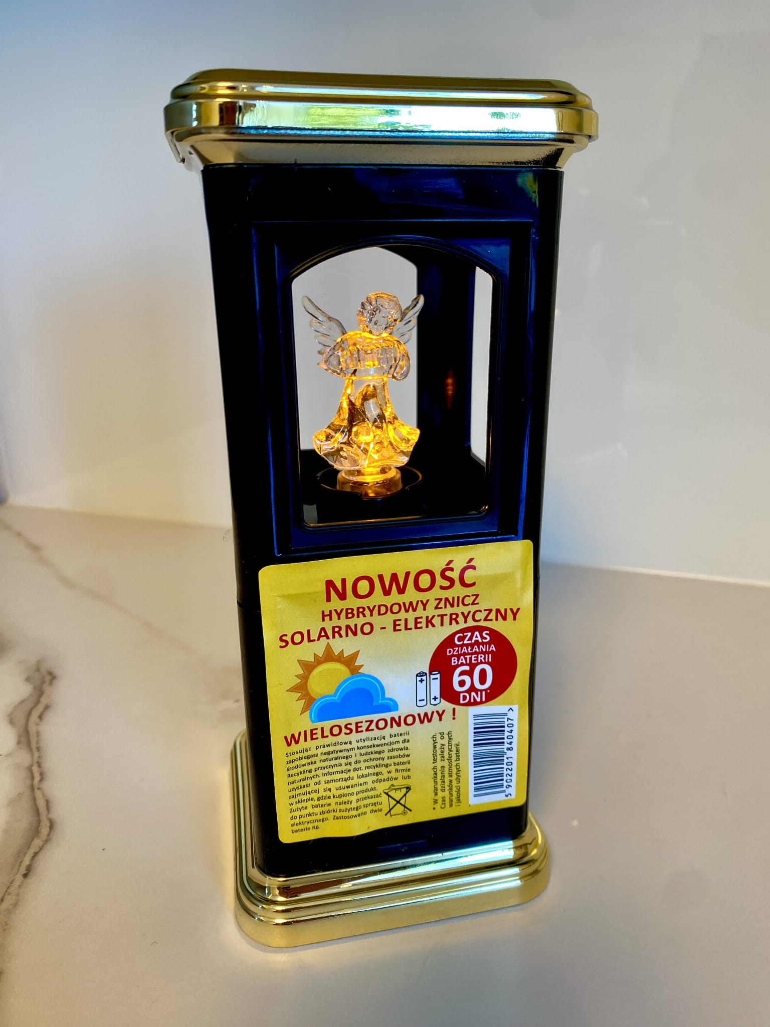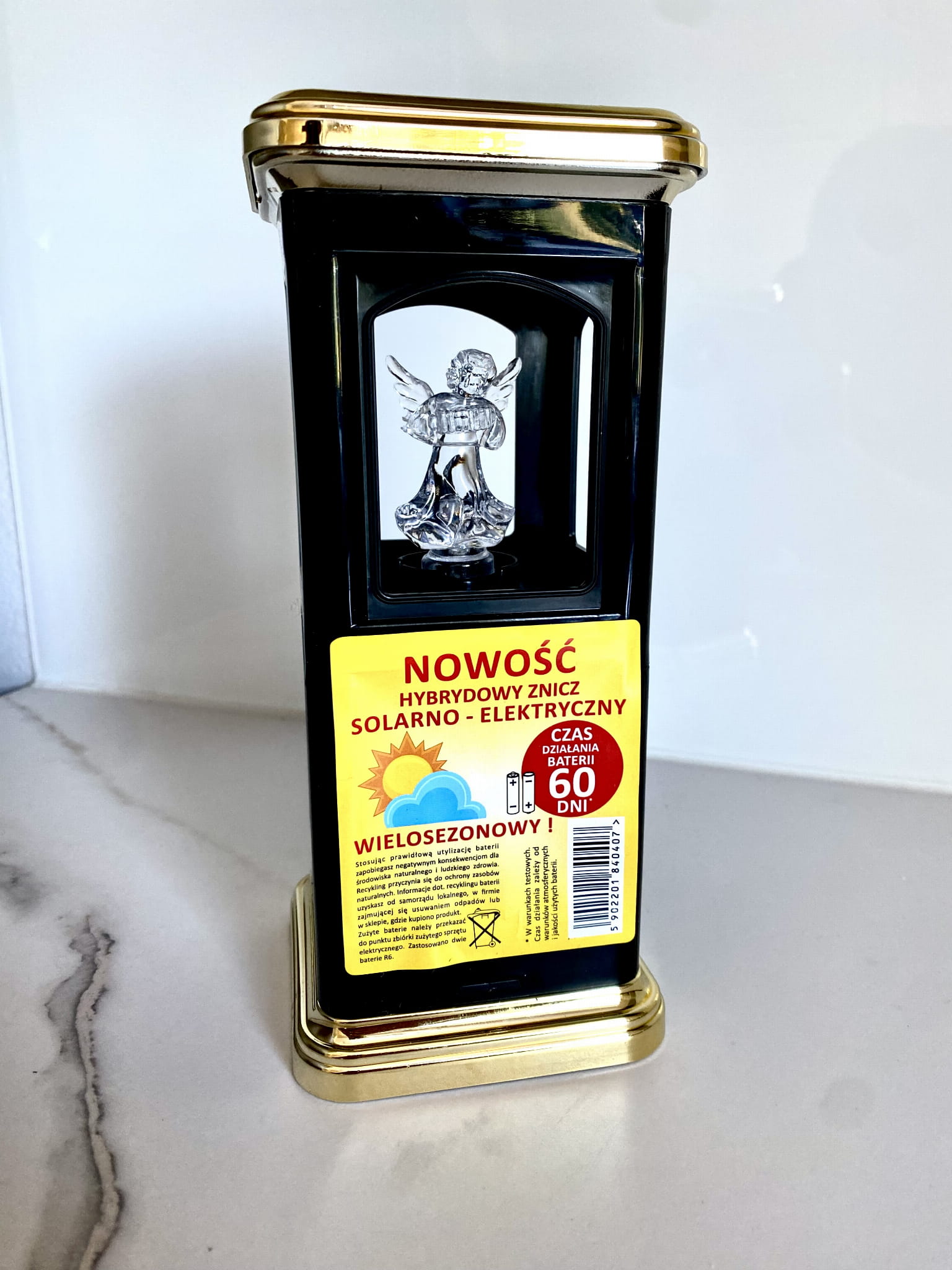 Elegancki czarno złoty znicz solarny elektryczny z aniołkiem na grób
